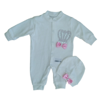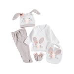Состав: 100% хлопок. Интерлок.Комплект из 5-ти предметов для девочки: распашонка с длинными рукавами, застежка внахлест на кнопку. Нагрудник, шапочка с цветным манжетом и декотативными ушками. Украшены аппликацией с вышивкой. Ползунки с закрытыми ножками, из трикотажа с рисунком. Цельнокроеный пояс с резинкой внутри. Рукавички дополнены атласными бантиками.